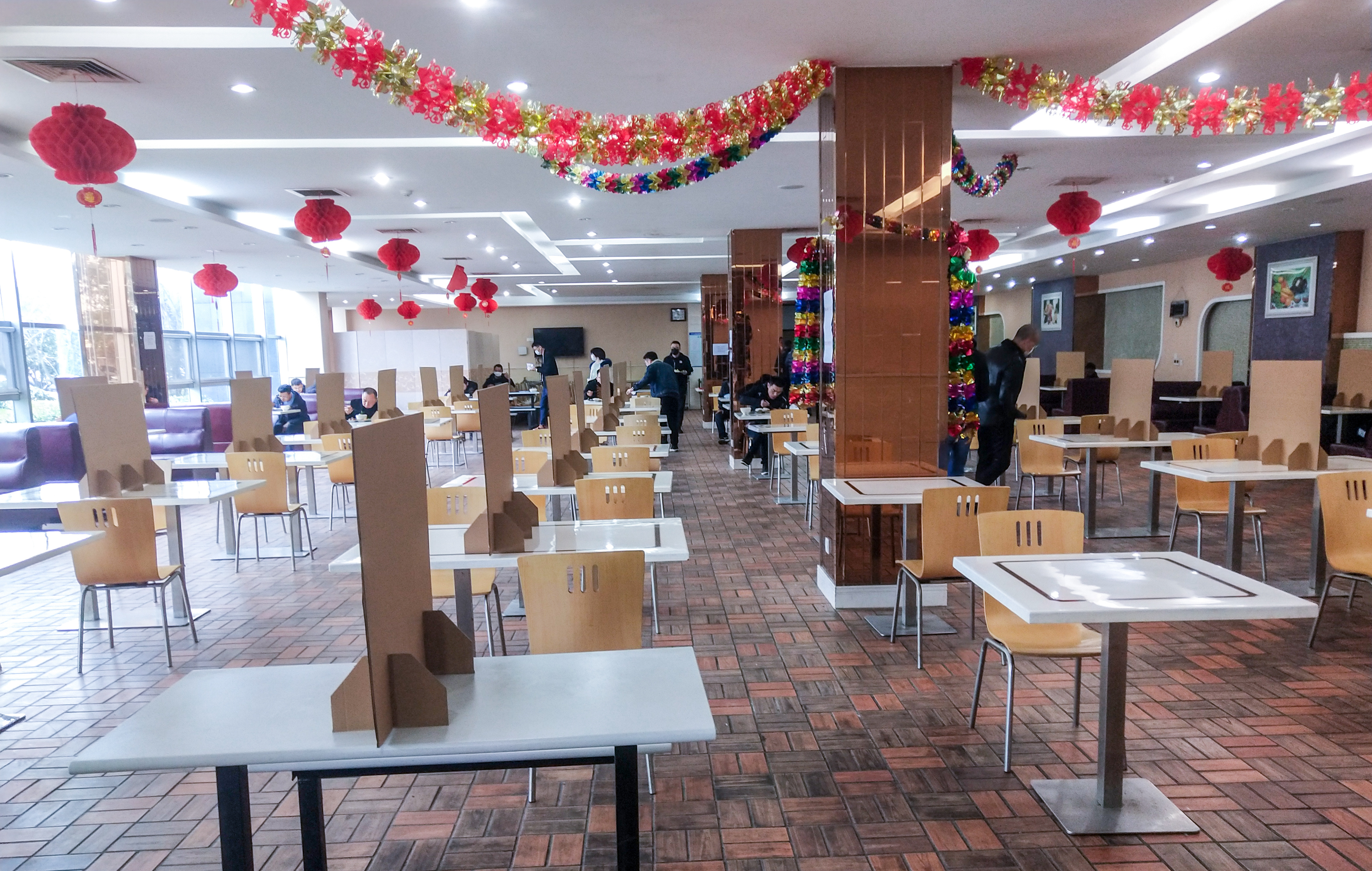 公司食堂實行人員錯峰分流措施,員工就餐分時分批、限時限流,避免人員在食堂中聚集,進(jìn)食堂前需檢測體溫,排隊取餐需間隔一米,每桌限坐2人,中間用板隔開,且一律同向而坐,避免隔桌交談。