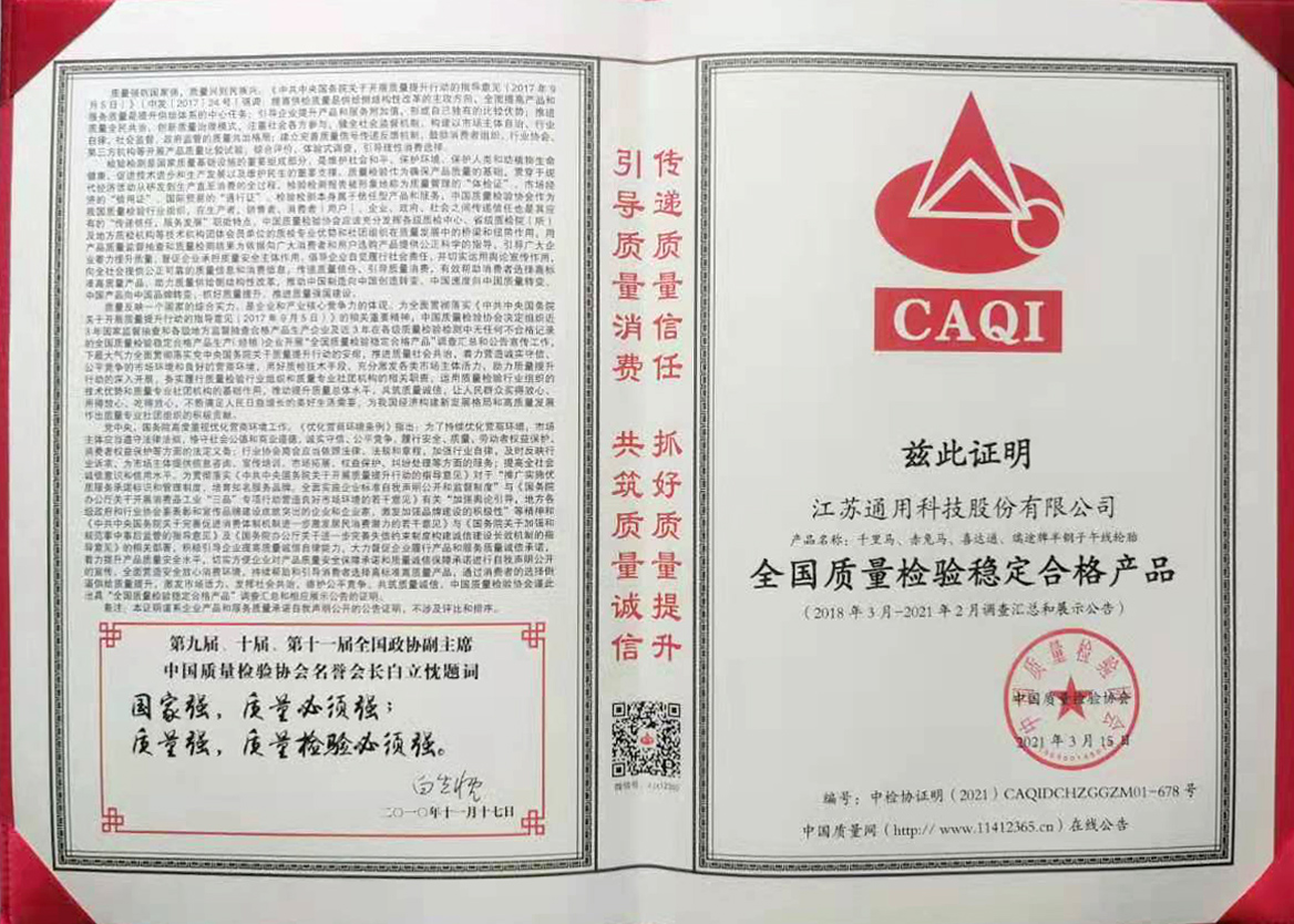 產(chǎn)品質(zhì)量是企業(yè)發(fā)展的基礎(chǔ),作為中國(guó)民族輪胎領(lǐng)軍企業(yè)之一,通用股份秉持“讓每一條輪胎成為精品”的企業(yè)使命,全方位深耕質(zhì)量管理,建立了嚴(yán)苛的產(chǎn)品質(zhì)量標(biāo)準(zhǔn),完善的內(nèi)部質(zhì)量監(jiān)控和管理體系,并形成了獨(dú)具特色的《質(zhì)量三字經(jīng)》、《輪胎當(dāng)自強(qiáng)》等質(zhì)量文化,從思想上引導(dǎo)、提升、深化全員質(zhì)量意識(shí)。公司從原材料采購(gòu)、生產(chǎn)制造到產(chǎn)品出廠,全面貫徹“質(zhì)量一票否決制”,一旦有產(chǎn)品質(zhì)量方面的問(wèn)題,絕對(duì)不允許進(jìn)入下一道工序,嚴(yán)把質(zhì)量關(guān),確保為客戶提供高質(zhì)量的優(yōu)質(zhì)產(chǎn)品。
